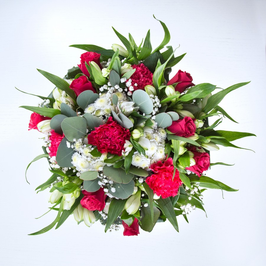 Experience the pinnacle of floral luxury with our Majestic Floral Splendor arrangement. This bouquet showcases an exquisite blend of elegant white chrysanthemums, airy gypsophila, bold red roses, and refined carnations, perfectly complemented by crisp white alstroemeria and rich aspidistra leaves. Every flower is selected by skilled hands to guarantee pristine freshness and an extraordinary display of nature's artistry.
