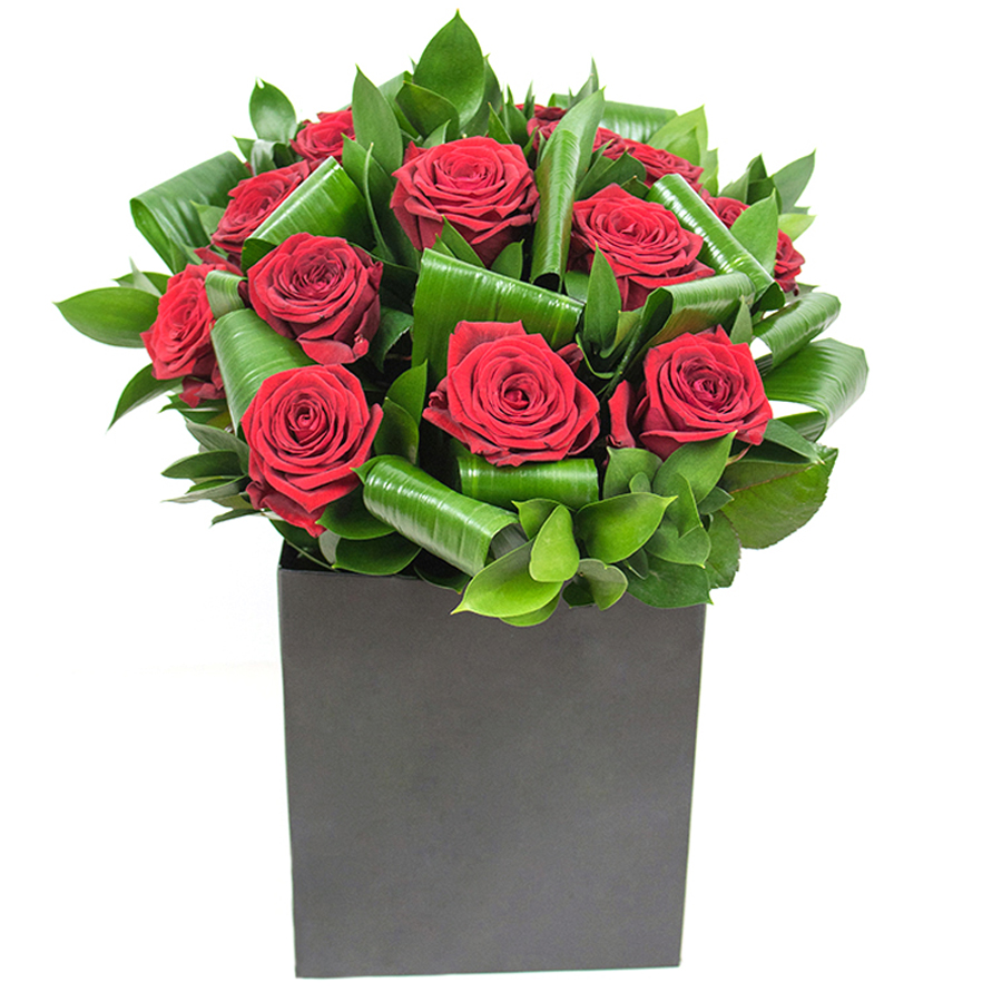 Experience the exquisite beauty of our red rose collection, featuring stunning red roses, vibrant aspidistra leaves, and elegant ruscus. This unique arrangement brings style and grace to any environment.